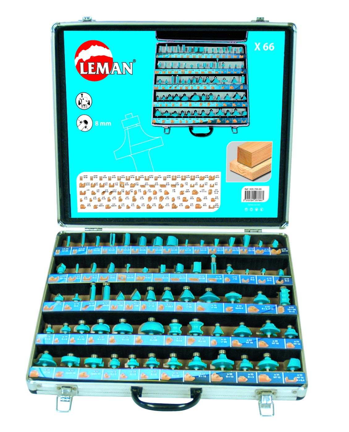 66 vienetų frezų rinkinys. 8 mm kotelis.