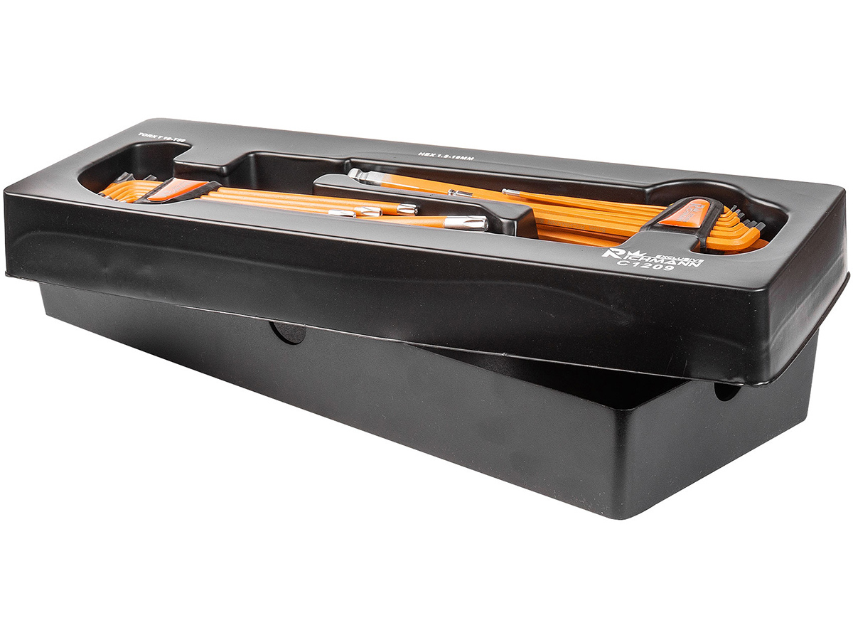 • Išsamus šešiakampių ir L formos raktų rinkinys.