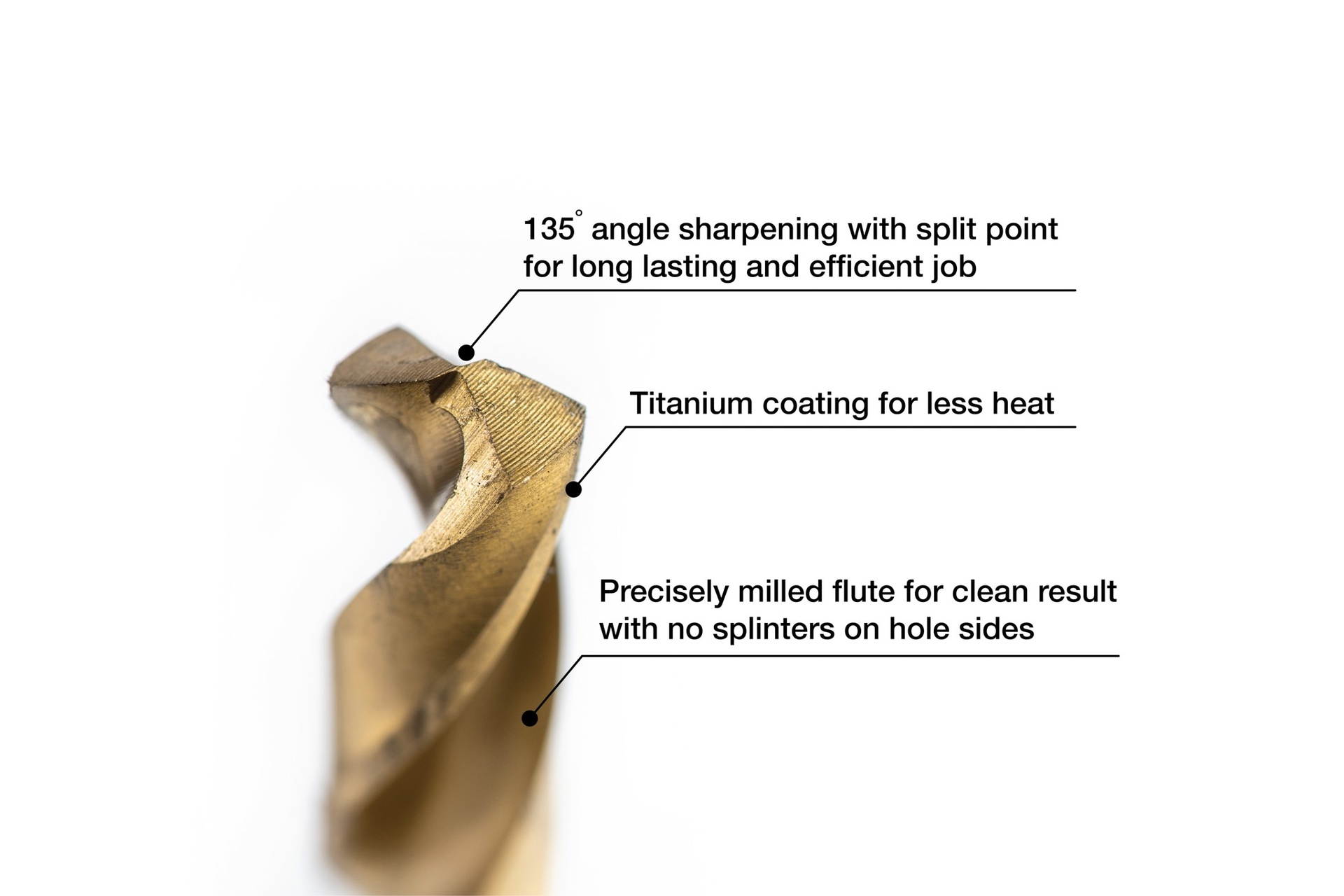 • 135° kampo grąžto viršūnė – efektyvesnis kietesnių medžiagų gręžimas.